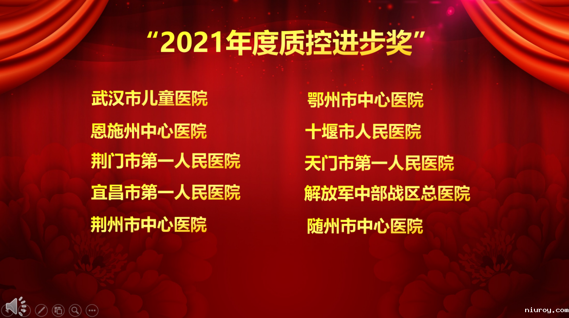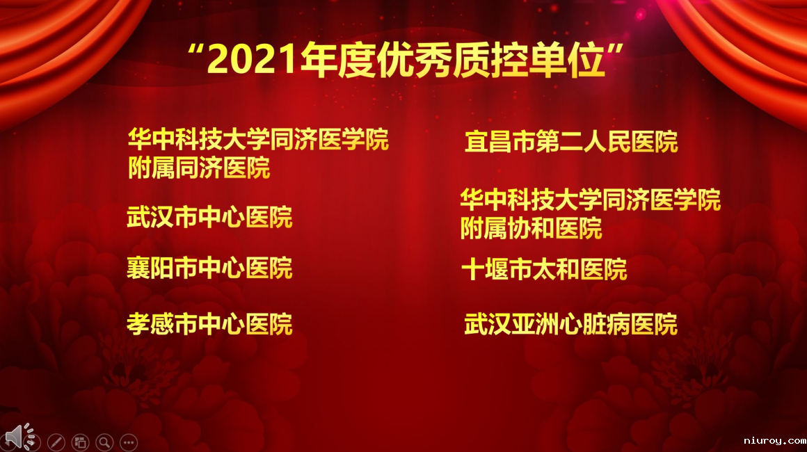 武汉第四医院副院长董骏武教授主持了闭幕式,对2021年度临床营养质控工作表现突出的单位进行表彰,它们分别是:华中科技大学同济医学院附属同济医院、华中科技大学同济医学院附属协和医院、宜昌市第二人民医院、十堰市太和医院、武汉市中心医院、襄阳市中心医院、孝感市中心医院、武汉亚洲心脏病医院。同时对10所在本年度质量控质有显著进步的医疗单位给予肯定。