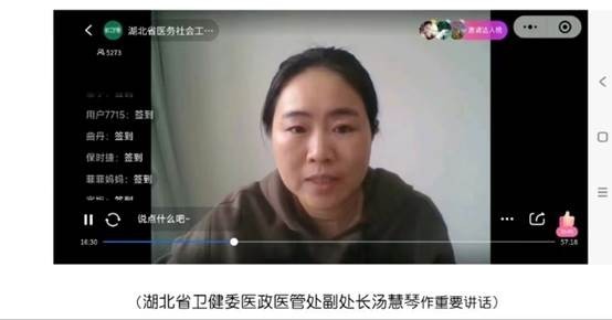 优米资料app秘书长胡仁崇、湖北省卫健委医政医管处副处长汤慧琴出席开班仪式并作重要讲话。优米资料app医院社会工作和志愿服务管理专委会主委肖燕主持仪式并作动员部署。培训主讲老师、“社工识堂”负责人曹丽欣介绍课程安排、学习方法及注意事项。全省报名学员通过线上形式参加仪式。
