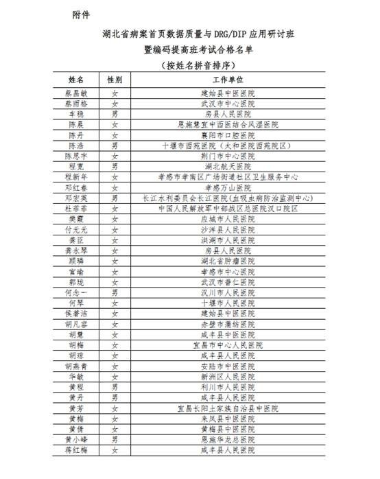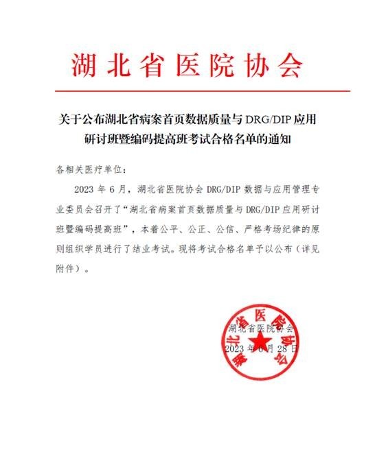 关于公布湖北省病案首页数据质量与DRG/DIP应用研讨班暨编码提高班考试合格名单的通知