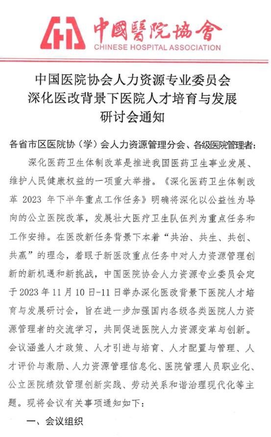 转:中国医院协会人力资源专业委员会深化医改背景下医院人才培育与发展研讨会通知