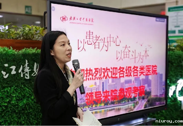 (武汉大学人民医院党委委员、副院长沈波教授在向参观人员介绍医院有关情况)