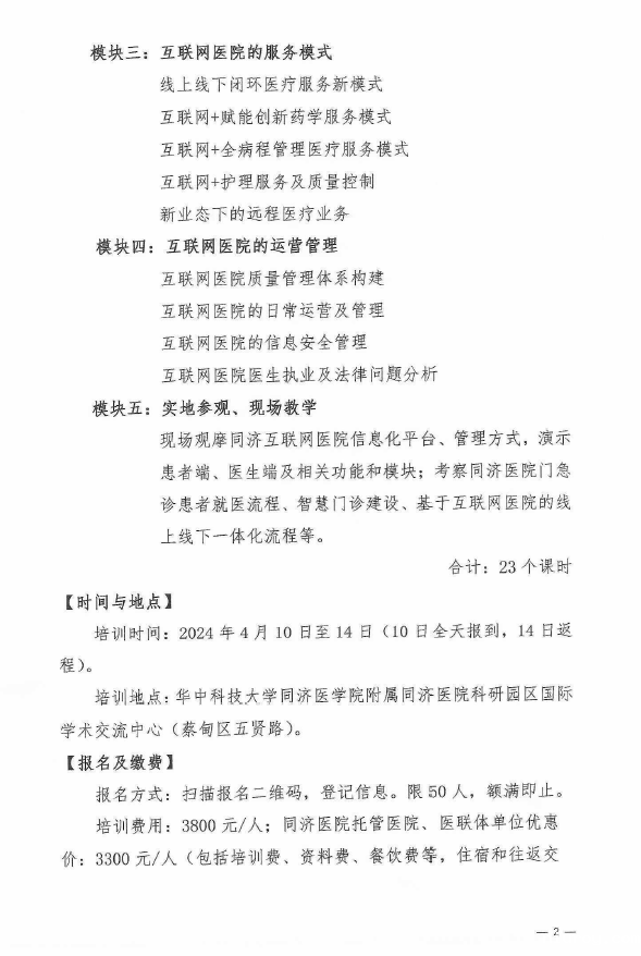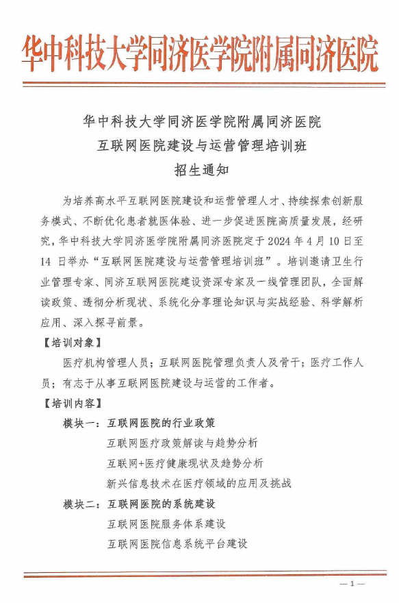 关于转发《华中科技大学同济医学院附属同济医院互联网医院建设与运营管理培训班招生通知》