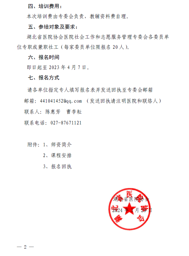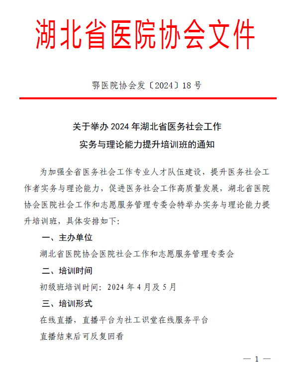关于举办2024年湖北省医务社会工作实务与理论能力提升培训班的通知