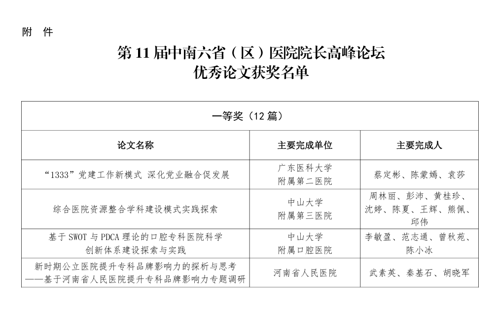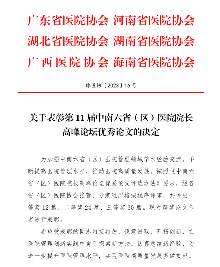 关于表彰第11届中南六省(区)医院院长 高峰论坛优秀论文的决定
