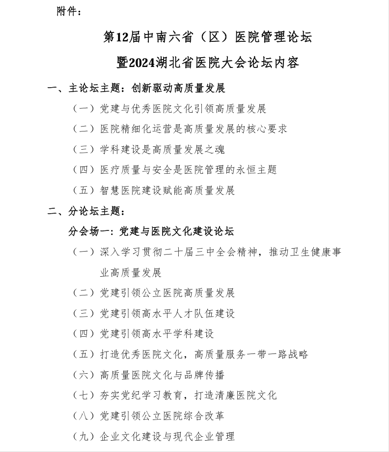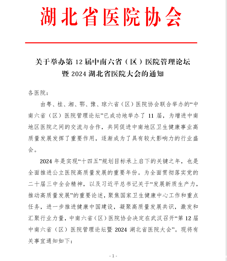 关于举办第12届中南六省(区)医院管理论坛暨2024湖北省医院大会的通知