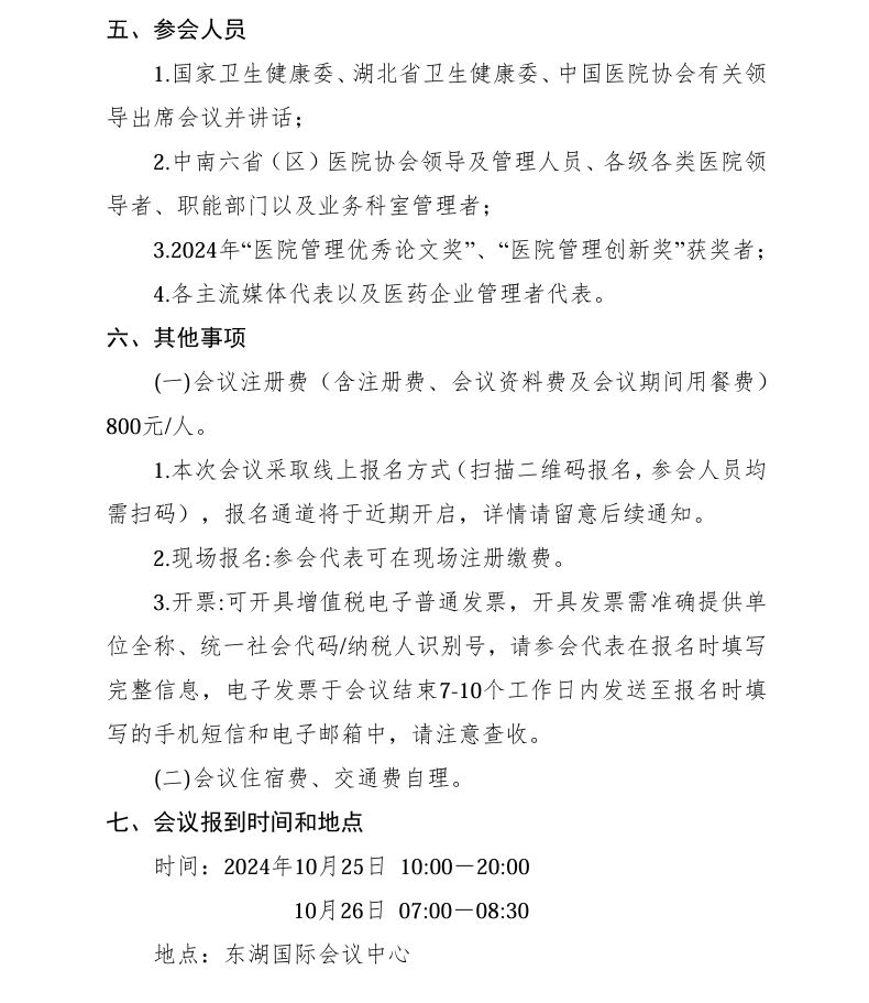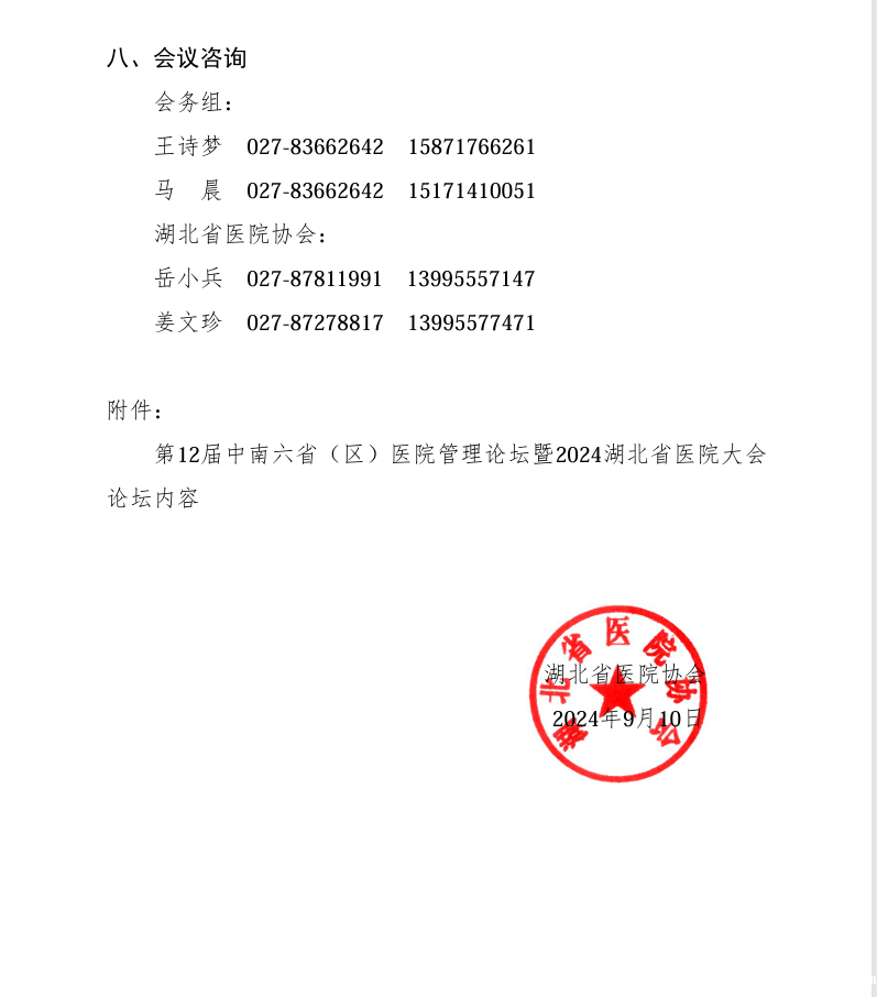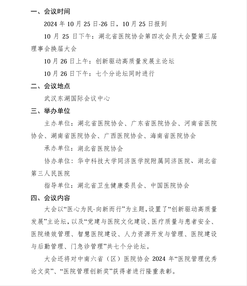 关于举办第12届中南六省(区)医院管理论坛 暨2024湖北省医院大会的通知(第二轮)